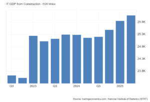 The construction sector in Italy continues to consolidate its strategic importance in the national economy. According to data from Trading Economics, Italy’s construction GDP rose to €26,091.10 million in the second quarter of 2025, up from €25,861.90 million in the first quarter.